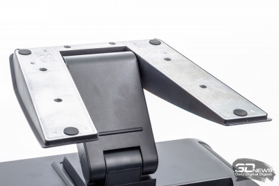 Основание опоры, выполненное из алюминиевого сплава, достаточно тяжелое. В данном случае это здорово помогает при изменении положения опоры — монитор не ерзает по столу. Кстати, стоит отметить довольно тугие шарниры, которые позволяют надежно удерживать заданное положение панели. Как и на весь корпус дисплея, на основание нанесено темно-серое матовое текстура, причем в нужных местах присутствуют специальные демпфирующие резиновые накладки, которые амортизируют удары частей опоры друг о друга во время складывания. В общем — сделано на века!