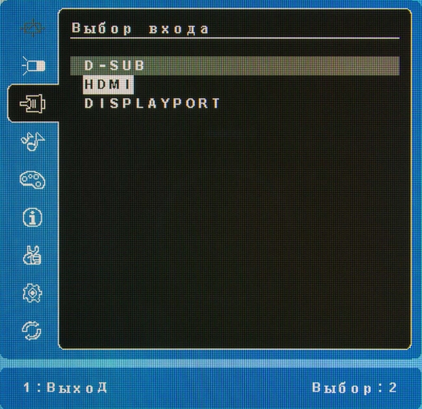 Подменю «Выбор входа» осуществляет коммутацию монитора с одним из трех источников сигнала.