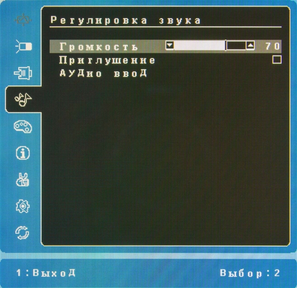 Пункт «Регулировка звука» посвящен настройке всего, что связано с воспроизведением аудиосигнала. Здесь пользователю доступны такие параметры, как громкость звучания, временное уменьшение уровня, а также выбор источника входного сигнала между входами HDMI или DisplayPort и портом Audio In.