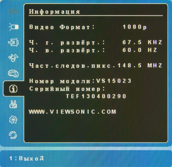 В пункте «Информация» можно узнать все о текущих параметрах входного сигнала, серийный номер и наименование модели, а также адрес официального сайта компании.