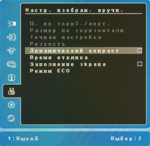 Подменю «Настройка изображения вручную», как правило, подразумевает огромное количество тонких регулировок для продвинутых пользователей. Но в данном случае это означает всего лишь активацию функции динамического контраста и задание времени отклика матрицы. Кроме того, здесь можно выбрать тип заполнения экрана в том случае, если соотношение сторон входного сигнала не соответствует физическим параметрам матрицы. А для ответственных пользователей доступно включение экономичного режима. В случае аналогового подключения становятся активными такие дополнительные свойства воспроизведения, как положение картинки по горизонтали и вертикали, размер по ширине, увеличение резкости изображения, а также тонкая регулировка параметров. На наш взгляд, название «Настройка сигнала» гораздо точнее бы отвечало назначению этого пункта, однако решение всегда остается за производителем.