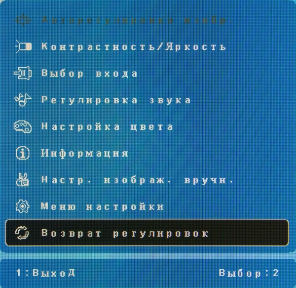 Дальше идет подменю «Возврат регулировок», которое позволяет осуществить сброс параметров до заводского уровня.