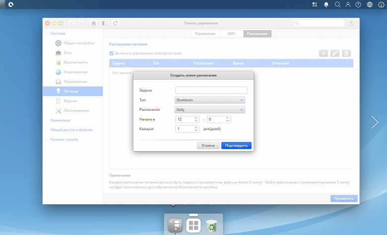 Сервер имеет возможность установки расписания работы. При этом в нем можно указать любое число действий из набора «выключить, перезагрузить, включить» на нужные дни недели с точностью до пяти минут. Реализована и поддержка ИБП, как подключаемых локально по USB, так и сетевых (SNMP). Кроме того, можно включить режим сна для жестких дисков, поддержку WOL и выключение в случае аварийной ситуации.