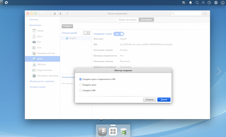 Сервер поддерживает работу с томами iSCSI. При этом можно использовать несколько целей, а сами LUN создаются на уже ранее настроенных пулах.