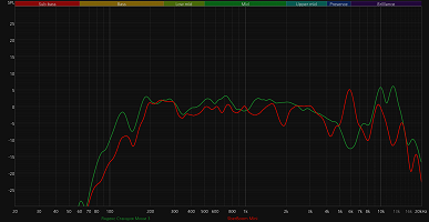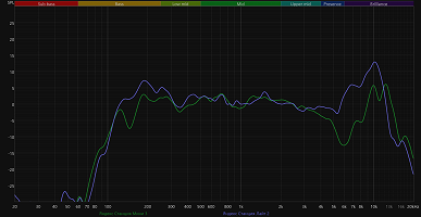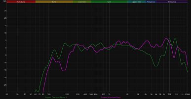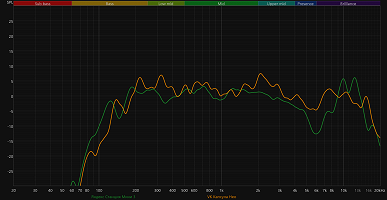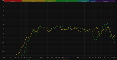 Далее графики усредняются, давая нам общую картину. Сразу отметим, что обещанный производителем бас от 110 Гц колонка действительно выдала, что замечательно. Но в целом особых причин для восторгов не наблюдается. Характер звучания по большей части определяется провалом в районе 6 кГц, который негативно сказывается сразу на многом: от звучания перкуссий и малого барабана до разборчивости вокала. Звучание получается очень «серединистое», что неплохо для «общения» с голосовым ассистентом, но в остальных случаях расстраивает.