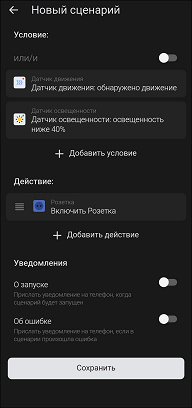В целом — всё. Но сообщения об ошибке не дают сохранить сценарий, при этом если переключиться на вариант «или», всё срабатывает. Придется тестировать вариант, в котором розетка включается, если в комнате что-то двигается или становится достаточно темно. Работает он корректно, розетка включается в нужный момент.