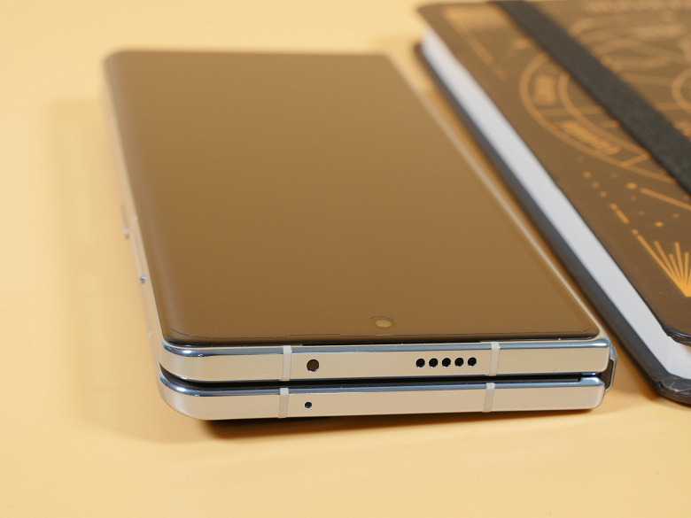 В сложенном состоянии аппарат не имеет видимой щели между половинками, как у Galaxy Z Fold. Психологически кому-то это может показаться важным. Как минимум, туда не попадут пыль и песчинки. Вокруг экрана присутствует небольшой бортик, предотвращающий полное соприкосновение частей экрана друг с другом. Открывать половинки неудобно: производитель сделал рамку плоской и гладкой, пальцы соскальзывают. Нужно было бы сделать более четко обозначенные скосы для захвата пальцами внутри — или хотя бы поверхность с насечками/пупырышками.