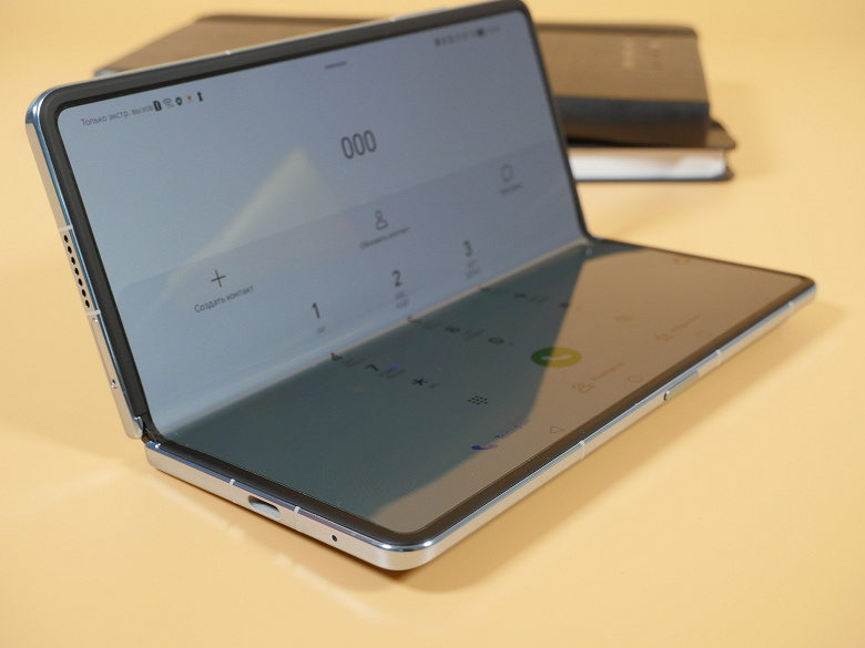 В разложенном состоянии половинки не имеют жесткой фиксации, они продолжают болтаться, если взять за одну сторону и покачать устройство. Вроде бы ничего страшного, но как-то непривычно. Корпус у аналога Samsung четко фиксируется, превращаясь в единую жесткую площадку, и ее необходимо с усилием разломить, чтобы начать схлопывание. Здесь такого нет. Нет четкой фиксации половинок и на промежуточных углах раскрытия, так что в мини-ноутбук с зафиксированными на 90 градусов половинками Honor Magic Vs превратить трудно.