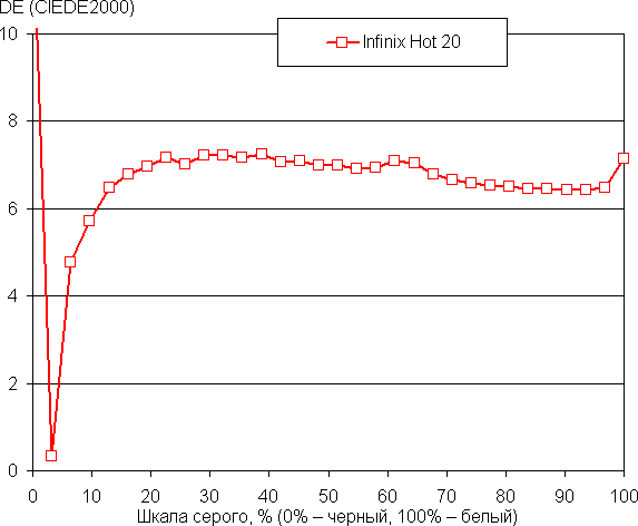 Баланс оттенков на шкале серого компромиссный, так как цветовая температура существенно выше стандартных 6500 К. Однако отклонение от спектра абсолютно черного тела (ΔE) на шкале серого ниже 10, что для потребительского устройства считается приемлемым показателем. При этом цветовая температура и ΔE мало изменяются от оттенка к оттенку — это положительно сказывается на визуальной оценке цветового баланса: