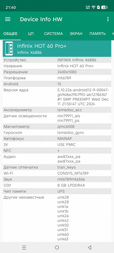 Смартфон Infinix Hot 60 Pro+ поддерживает мобильные сети вплоть до 4G, два диапазона Wi-Fi 6 и Bluetooth 5.4, NFC. Поддержки e-SIM нет. На практике в пределах городской черты московского региона аппарат демонстрирует уверенную работу в беспроводных сетях, не теряет связь, быстро восстанавливает связь после вынужденного обрыва. Все необходимые встроенные датчики вплоть до гироскопа на месте. Также приятно, что датчик приближения физический, а не виртуальный.