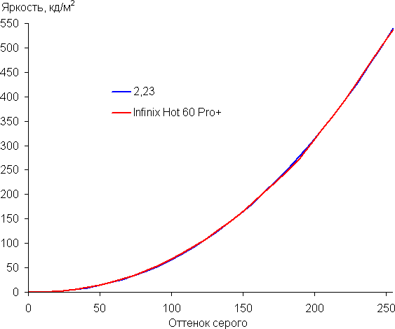 Напомним, что в случае OLED-экранов яркость фрагментов изображения динамично меняется в соответствии с характером выводимого изображения — слегка уменьшается для светлых в целом изображений. В итоге полученная зависимость яркости от оттенка (гамма-кривая), скорее всего, немного не соответствует гамма-кривой статичного изображения, так как измерения проводились при последовательном выводе оттенков серого почти на весь экран.
