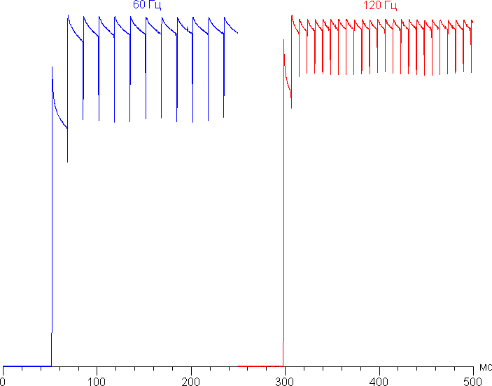 Видно, что основная частота модуляции увеличилась в 2 раза (относительно режима с 60 Гц). Видимого мерцания всё так же нет.