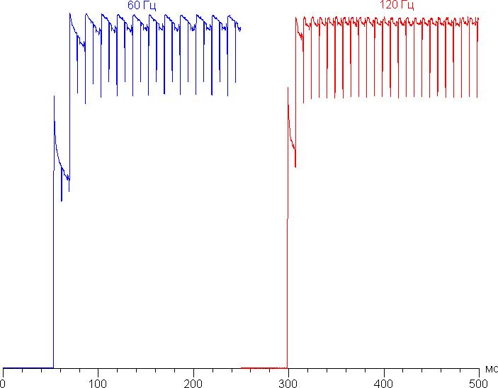 Переключение состояния элементов матрицы выполняется практически мгновенно, но на фронте включения может присутствовать ступенька шириной примерно 17 мс (что соответствует частоте обновления экрана примерно в 60 Гц) или примерно 8 мс (120 Гц). Например, так выглядит зависимость яркости от времени при переходе от черного к белому (режим 60 Гц и 120 Гц):