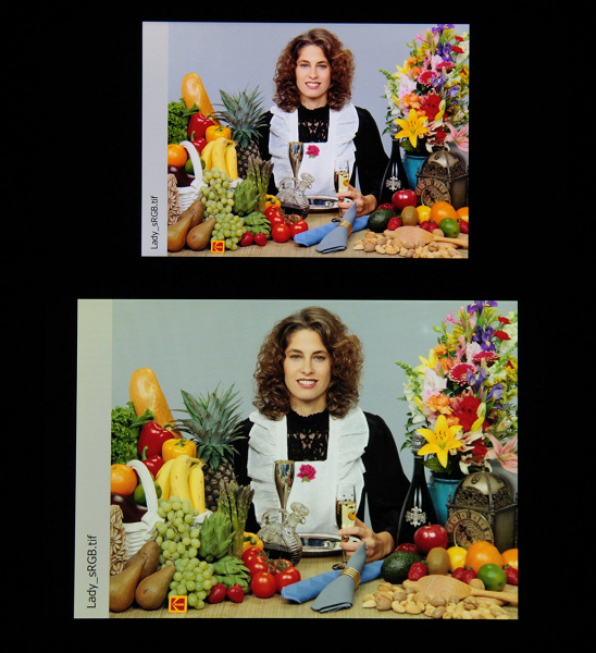 Отметим, что на экранах с широким цветовым охватом (без соответствующей коррекции) цвета́ обычных изображений, оптимизированных для устройств sRGB, выглядят неестественно насыщенными. Отсюда и рекомендация: в большинстве случаев смотреть кино, фотографии и все естественное лучше при выборе профиля Нежность, в котором хотя бы нет увеличения цветового контраста.