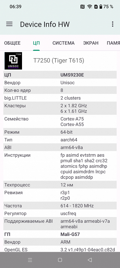- SoC Unisoc T7250, 8 процессорных ядер (2×Cortex-A75 @1,8 ГГц + 6×Cortex-A55 @1,6 ГГц)