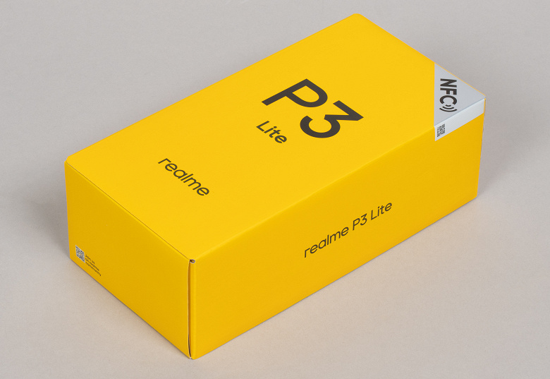 Смартфон Realme P3 Lite поставляется в картонной упаковке нестандартного строения с крышкой внахлест с оформлением в фирменных цветах.