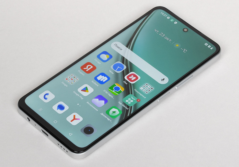 Переднее стекло плоское, с достаточно широкой по современным меркам рамкой вокруг дисплея, особенно в области «подбородка». Фронтальная камера установлена в привычном круглом вырезе в матрице экрана, это не самое дешевое решение на сегодня.