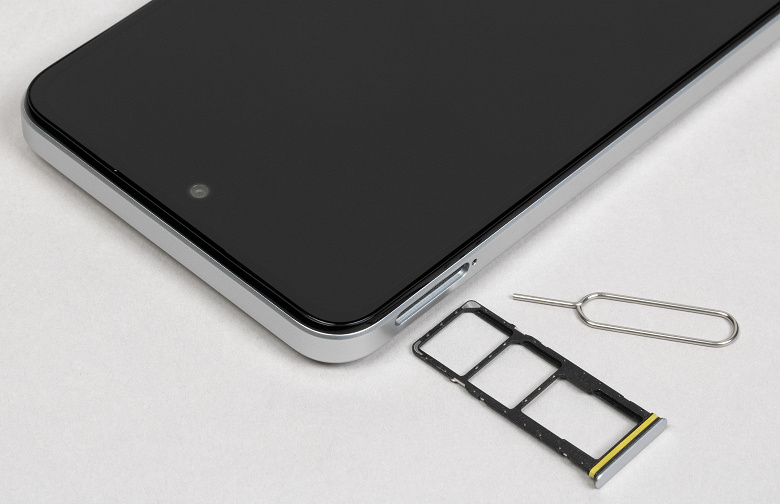 Выдвижной лоток в этой модели находится сверху на левой боковой грани. Он может принять две карты Nano-SIM и карту памяти microSD.