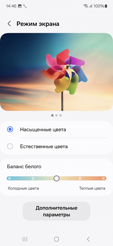 Почему-то только при выборе профиля Насыщенные цвета появляется возможность настройки цветового баланса регулировкой цветовой температуры и тремя регулировками интенсивности основных цветов, но из-за слишком широкого цветового охвата как раз в этом профиле нет смысла исправлять именно баланс.