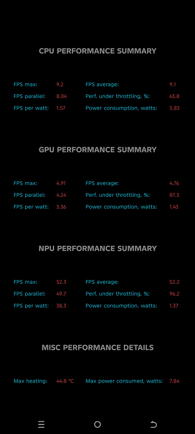 Тест на снижение производительности при нагреве мы проводим с помощью программы Burnout Benchmark, которая позволяет нагружать CPU, GPU и NPU. Заметно, что уровень тротлинга нетипично низкий.