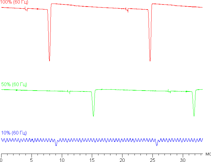 На высоком и среднем уровне яркости присутствует значимая модуляция с частотой 60 или 120 Гц. На рисунках ниже приведены зависимости яркости (вертикальная ось) от времени (горизонтальная ось) для нескольких значений настройки яркости. Сначала для режима с частотой обновления 60 Гц: