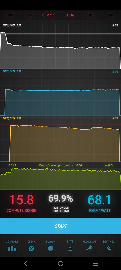Тест на снижение производительности при нагреве мы проводим с помощью программы Burnout Benchmark, которая позволяет нагружать CPU, GPU и NPU: