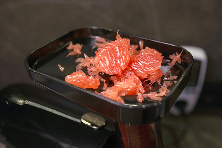 Мощность, потребляемая соковыжималкой, напрямую зависит от жесткости обрабатываемого сырья. Зафиксированный нами максимум — 151 Вт при отжиме сока из моркови, что почти соответствует заявленной номинальной мощности. Во время обработки грейпфрутов мощность составила 64 Вт, при обработке сельдерея с яблоками и виноградом — 111 Вт.
