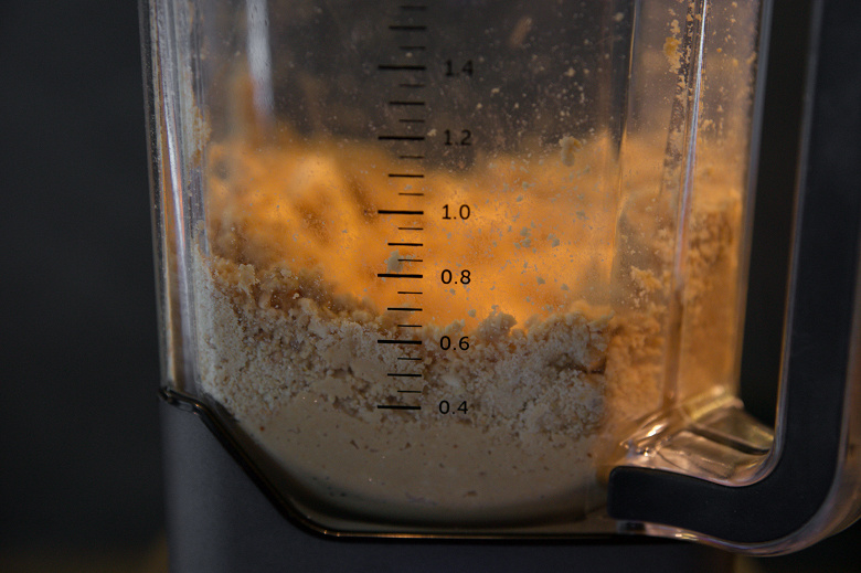 В процессе пару раз пришлось останавливать блендер, чтобы взять кувшин в руки и встряхнуть содержимое, так как оно периодически скапливалось по краям, а в центре ножи прокручивались вхолостую. Через 2,5 минуты мы получили густую вкусную пасту без целых кусочков.