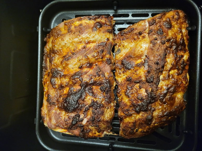 Мы готовили в этом приборе картофель-фри двумя способами (домашний и из полуфабриката), свиные ребра, круассаны, свиную шею, запеченные яблоки. Картофель получился мягким внутри и подрумяненным снаружи, но есть нюанс: если готовить из сырой картошки, то время приготовления будет длительным — 30 минут, из полуфабриката быстрее. Ребра вышли с хорошей корочкой и сочной текстурой, все остальное тоже заслужило высокую оценку. Однако мы выяснили, что загрузка чаши больше 300—400 г требует перемешивания и переворачивания продуктов: свободной циркуляции горячего воздуха недостает.