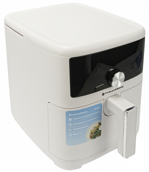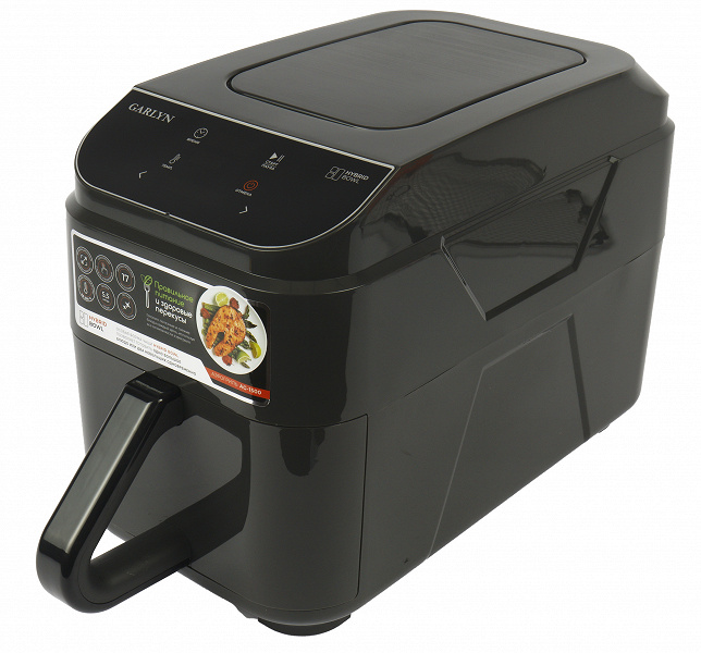 Этот небольшой аэрогриль (производитель называет прибор аэрофритюрницей) рассчитан на приготовление еды для 1—2 человек. Сенсорную панель управления полностью русифицирована (редкость, обычно ограничиваются не всегда понятными пиктограммами), можно выбрать либо автоматическую программу, либо вручную задать время и температуру. Стеклянная емкость позволяет визуально контролировать процесс, ее легко мыть, ручка в процессе работы остается прохладной.