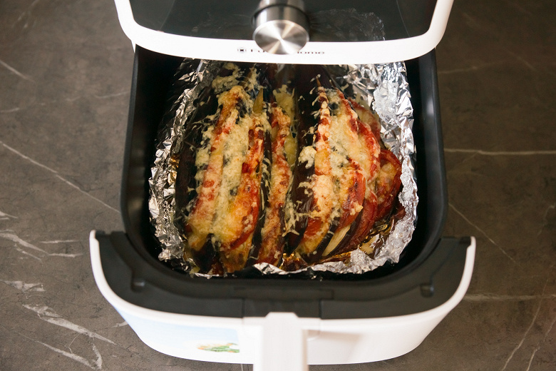 В нашей лаборатории в этом аэрогриле приготовлены баклажаны с помидорами, чесноком и сыром (30 минут при 200 °C) — блюдо запеклось равномерно; семга (15 минут при 160 °C, затем 5 минут при 200 °C) получилась хорошо поджаренной; куриные бедрышки (25 минут при 200 °C) — без пересушивания; маффины (30 минут при 180 °C) — влажные внутри; йогурт (8 часов при 40 °C) — стабильной консистенции.