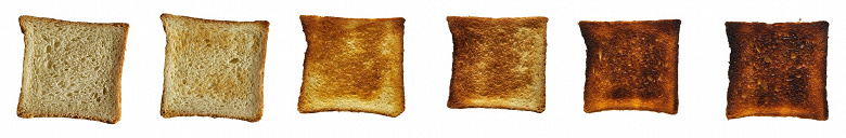 Степень прожарки тостов традиционно ориентирована на белый тостовый хлеб. На фотографии ниже (слева направо) мы показываем степень готовности тостов, соответствующую делениям от 1 до 6.