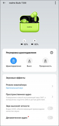 В блоке «Звуковые эффекты» можно выбрать один из четырех предустановленных профилей звучания или создать свой при помощи шестиполосного эквалайзера — за эту возможность Realme Buds T200 стоит похвалить отдельно, ее не хватает многим бюджетным гарнитурам.