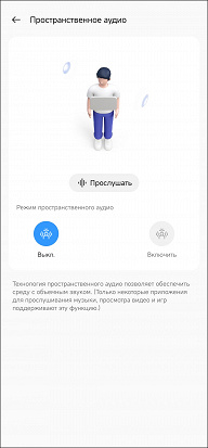 Функция «Пространственное аудио» позволяет добавить немного объема в звучание за счет задержек и реверберации — послушать, как это работает, можно прямо в приложении. На особый вау-эффект рассчитывать не стоит, но игрушка интересная.