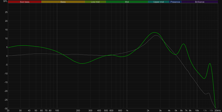 График выше показан на фоне кривой IDF (IEM diffuse field compensation), предоставленной производителем используемого стенда. Ее задача — помочь скомпенсировать резонансные явления в имитированном слуховом канале и особенности оборудования, создав «звуковой профиль», максимально корректно иллюстрирующий то, как звучание наушников воспринимается слушателем. Ее можно рассматривать как адаптированный под конкретное устройство аналог так называемой «кривой Хармана», созданной командой Harman International под руководством доктора Шона Олива. Скомпенсируем полученный график АЧХ в соответствии с кривой IDF.