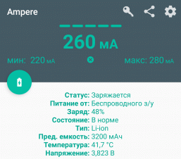Задействуется 9-вольтовый режим, потребляемый смартфоном ток в начале процесса достигает 1,2–1,3 А, при этом приложение Ampere показывает, что аккумулятор заряжается током около 2,4 ампера (начинает понемногу снижаться лишь через 40–45 минут); температура была чуть меньше, чем при беспроводной зарядке — в пределах 41 °C.