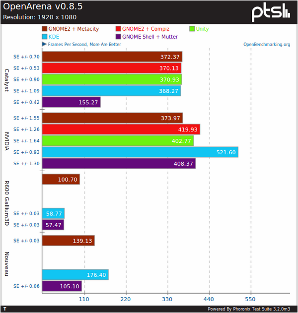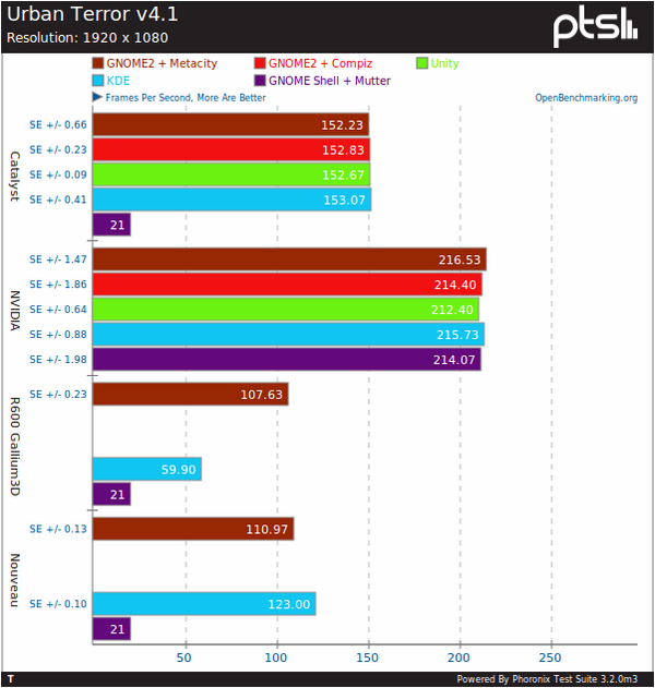 В работе игры Urban Terror под управлением GNOME Shell и Mutter с драйвером Catalyst производительность отстает от других систем в 7 раз.
