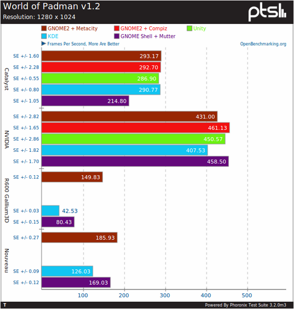 В игре World of Padman заметен только провал производительности при использовании GNOME Shell и Mutter с драйвером Catalyst. Производительность KDE при использовании драйвера NVIDIA на несколько процентов отстает от других окружений.