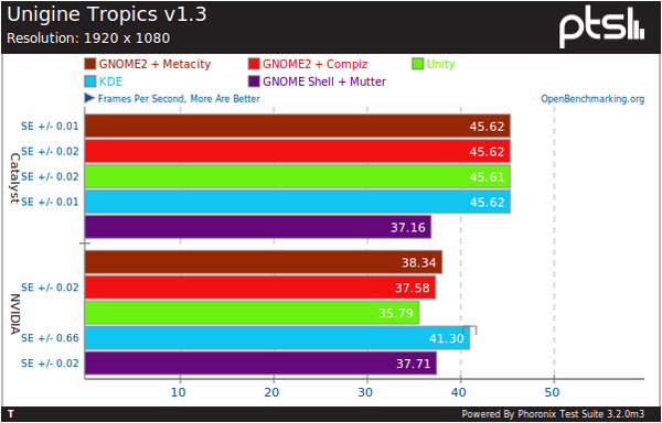 Ресурс Phoronix провел оценку производительности при выполнении популярных игровых приложений при использовании Unity с Compiz, GNOME 2 с Metacity, GNOME 2 с Compiz, GNOME Shell c Mutter и KDE с KWin, в сочетании с открытыми и проприетарными драйверами для карт NVIDIA и ATI/AMD. Цель теста - выявление возможных проблем с двойной буферизацией в композитных менеджерах в процессе выполнения интенсивно работающих с графикой приложений (например, будущая версия kwin будет автоматически отключать композитный режим при запуске приложений в полноэкранном режиме).При оценке производительности игры Nexuiz наблюдалось замедление на 50% при работе связки GNOME Shell и Mutter в сочетании с проприетарным драйвером AMD Catalyst, и на 10% при работе GNOME 2 с оконным менеджером Metacity. При использовании драйвера NVIDIA игра Nexuiz работала в KDE на 15% быстрее, чем в других окружениях. Похожие результаты наблюдались и при выполнении игр OpenArena, Unigine Engine и Warsow, но в игре Warsow дополнительно наблюдается 30% падение производительности при использовании Unity.