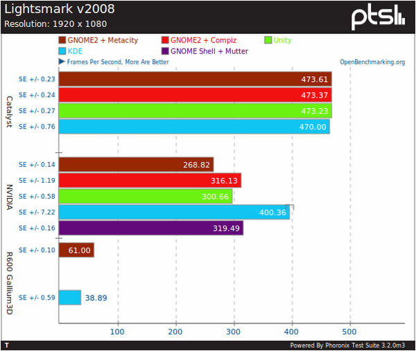 В тесте Lightsmark 2008 при использовании драйвера Catalyst наблюдается примерно идентичная производительность, но при использовании драйвера NVIDIA вперед вырывается KDE, опережая другие системы на 25-30%. Среди отстающих GNOME Shell и Mutter.