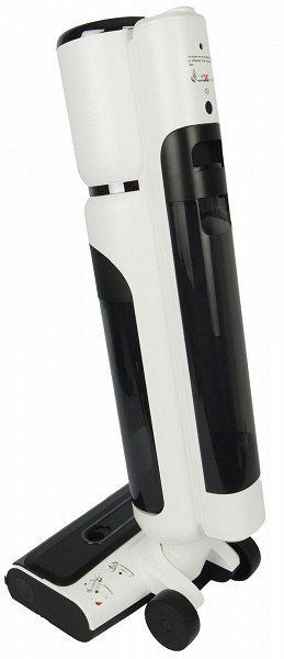В верхней части корпуса расположен моторный блок с несъемным аккумулятором и дисплеем. Спереди к моторному блоку крепится резервуар для грязной воды с системой фильтрации, а бак для чистой расположен сзади. Вода подается на пол и засасывается вместе с грязью: воздушная струя с водой и мусором попадает в резервуар для грязной воды через центральную шахту. Вода и сор остаются на дне резервуара, а на выходе из него воздуха установлен HEPA-фильтр.