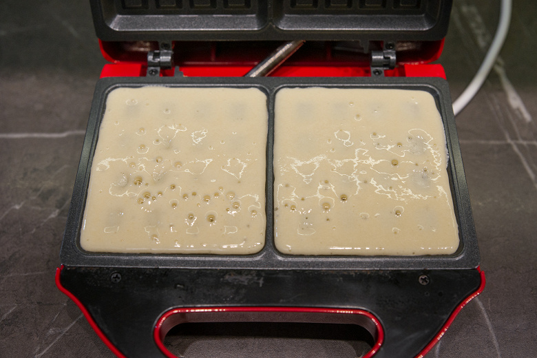 Корочка была неравномерной, да и нагрев снизу заметно сильнее, так что мы перевернули вафли.