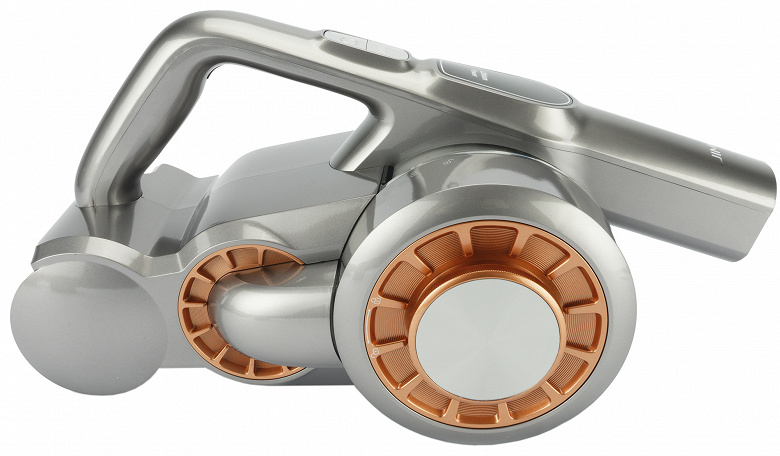 Корпус пылесоса выполнен из гладкого серо-стального пластика, элементы отделки — медно-золотые.