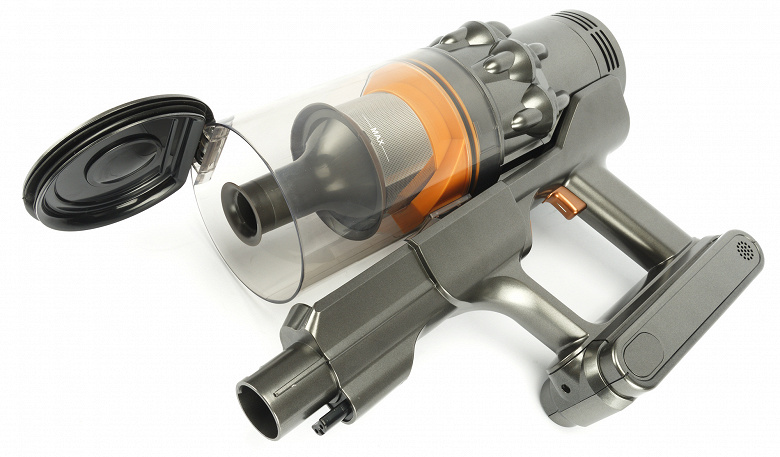 Прозрачный корпус мусоросборника позволяет легко контролировать заполнение резервуара. Отметим хорошее качество пластика: после нескольких интенсивных уборок мы не наблюдаем характерного помутнения внутренней поверхности, вызываемого вращением в циклоне твердых частиц.