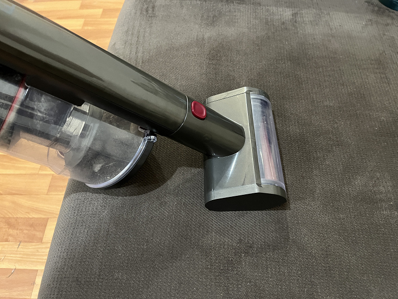 В конце мы испытали щелевую насадку. Пылесос не сбавлял мощности, даже упираясь вглубь дивана, и отлично высасывал оттуда скопившуюся грязь и шерсть.