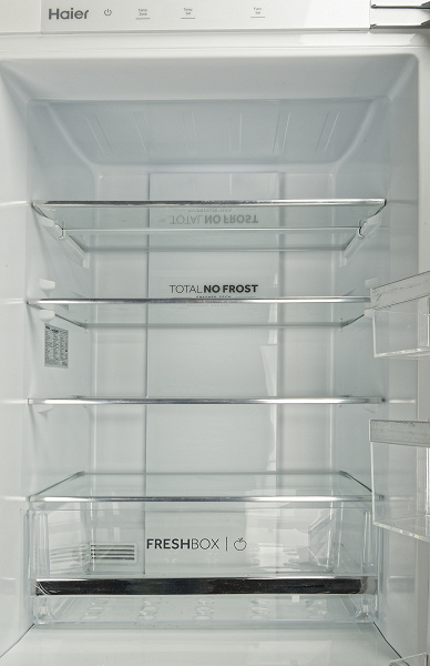 Ящики опираются на пластиковые направляющие с роликами и снабжены дополнительными стеклянными разделителями. За пластиковым кожухом располагаются воздуховоды системы вентиляции: и холодильное, и морозильное отделения оборудованы системой NoFrost.