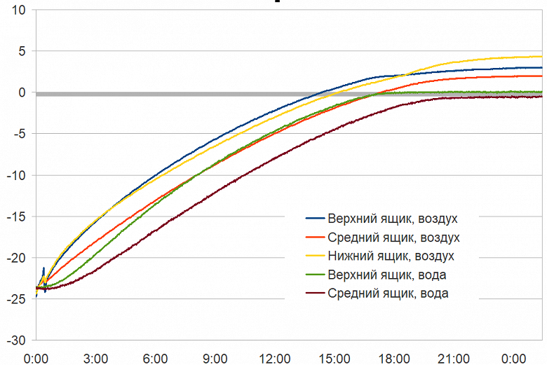 Чтобы оценить замораживающую способность холодильника, мы поместили контейнеры с водой комнатной температуры в средний и нижний ящики морозильной камеры и включили режим максимального охлаждения. Результаты измерений температуры воды и воздуха можно видеть на графике ниже.