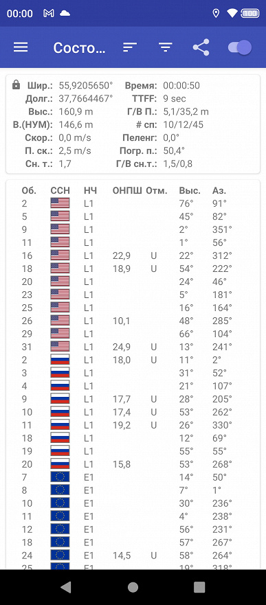 Навигационный модуль работает с GPS (с A-GPS), Глонасс, Galileo и BDS. Первые спутники при холодном старте обнаруживаются быстро, точность позиционирования не вызывает претензий. Среди встроенных датчиков нашлись магнитный компас и даже гироскоп.