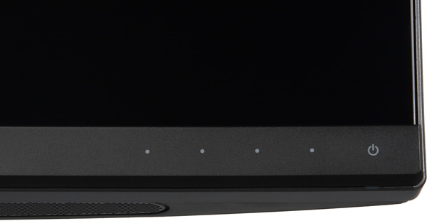 Фронтальная поверхность экрана выглядит как монолитная черная матовая (вернее, полуматовая — при прямом отражении видно точечные источники света) поверхность, ограниченная снизу относительно узкой рамкой из матового черного пластика, а по периметру — узкой окантовкой из пластика с темно-серой серебристой поверхностью. Выведя изображение на экран, можно увидеть, что на самом деле между внешними границами экрана и собственно областью отображения есть поля сверху и с боков порядка 12–13 мм (и до рамки снизу порядка 3 мм). Кнопки сенсорные, их местоположение на рамке обозначено неконтрастными точечками и значком питания.