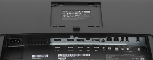 Вверху на задней панели — узкая вентиляционная решетка. На нижней плоскости блока экрана есть стальная решетка с черным матовым покрытием, за которой расположены встроенные в монитор громкоговорители. Разъем питания и почти все интерфейсные разъемы расположены в нише на задней панели и ориентированы вниз. К монитору прилагается кабельная крышка, почти полностью закрывающая эту нишу, остается только прямоугольный вырез для вывода кабелей. Слева (если смотреть сзади) от этой ниши можно обнаружить разъем для кенсингтонского замка, справа один из четырех выходных разъемов USB и единственный с повышенной нагрузочной способностью (на что указывает значок молнии). Монитор оснащен встроенным блоком питания. Внешние панели подставки изготовлены из пластика с серо-серебристым покрытием или с матово-черной поверхностью. Нижняя панель основания — из черного пластика с матовой поверхностью. Штатная подставка позволяет блок экрана немного наклонить вперед, отклонить назад, приподнять и повернуть вправо-влево.